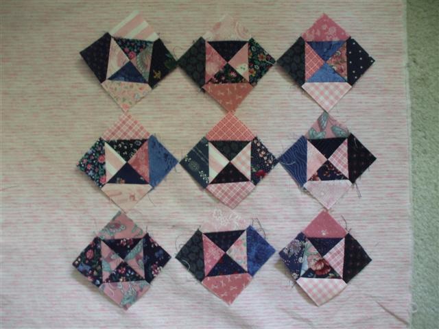 I've had a couple of sleepless nights which really sap my energy level. I found a bag of 'waste' half-square triangles last week and sat and talked to my sister this afternoon instead of napping-which would have given me ANOTHER sleepless night-and finger pressed them open. So last night I had to figure out a way to use